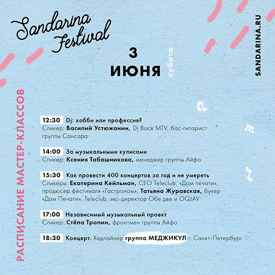 Дождались! Уже в эти выходные,3-4 июня пройдет одно из самых атмосферных и ярких мероприятий нашего города SANDARINA SUMMER FESTIVAL, главной темой которого станет - МУЗЫКА. Гостей ждет самый большой дизайнерский маркет в УрФо с 120 участниками, лекторий с известными музыкантами и продюсерами города,модные показы, музыкальный бокс, детская игровая, концерт питерской группы МЕДЖИКУЛ, вело-тест-драйв, эпатажные луки и многое другое. Чем будет удивлять фестиваль?