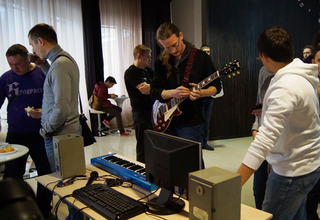 Во время кофе-брейка каждый гость мог протестировать мультимедийные возможности Linux на специально собранном стенде с подключенной к нему гитарой и миди-клавиатурой. Так для себя можно было открыть возможности нового гитарного процессора Rakkatrack и удобного приложения для коммутации программ - Patchage.