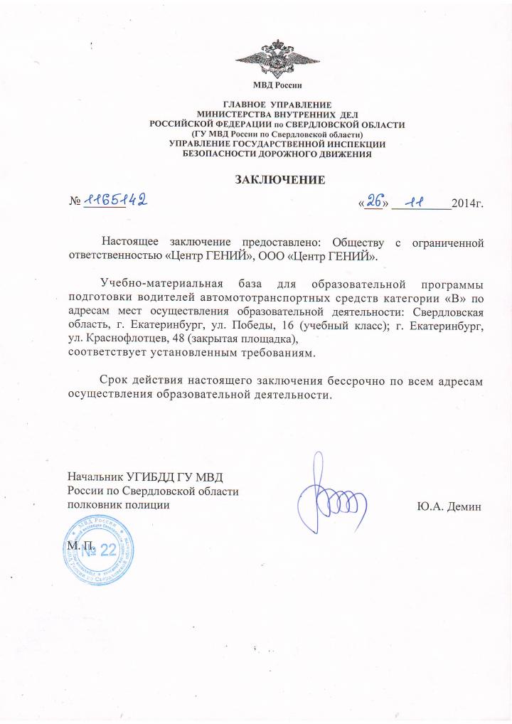 Автошкола ООО "Центр ГЕНИЙ" 26 ноября 2014г. получила заключение из ГИБДД о готовности работы по новым программам.