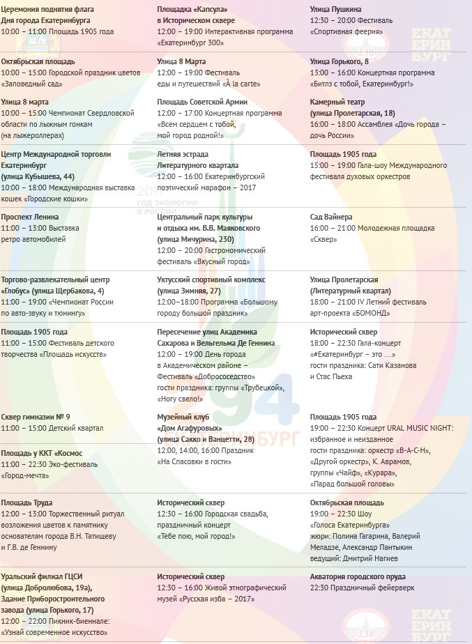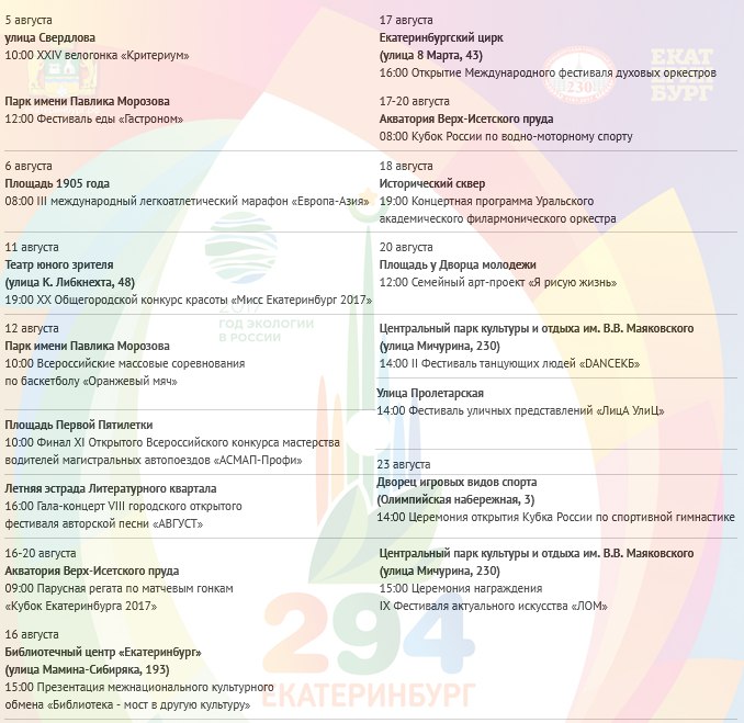 19 августа 2017 года Екатеринбург отметит День города. В этом году Екатеринбургу исполнится 294 года.